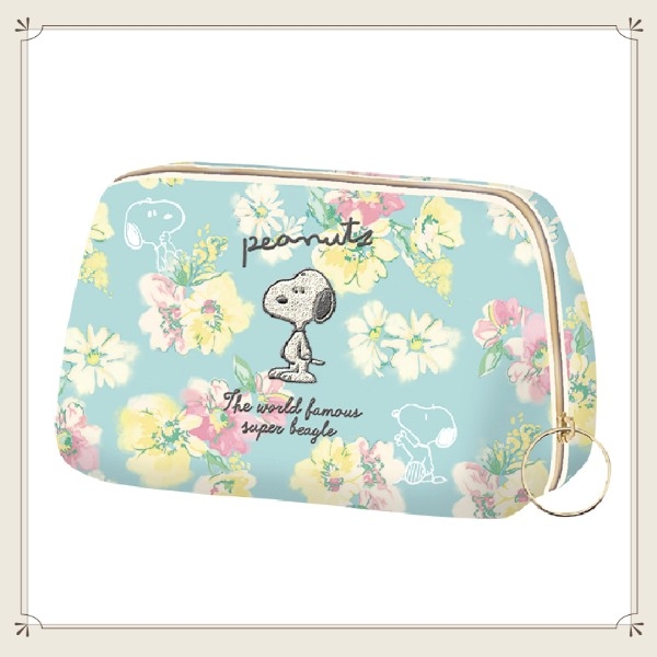 刺繍のスヌーピー心をくすぐる花柄ポーチは、水彩タッチで華やかなのにやさしいデザイン。フェミニンなアイテムが好きなあなたにおすすめです。