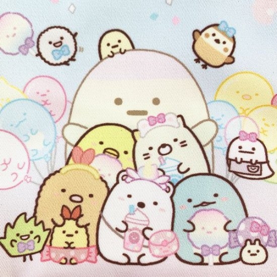 こちらも遊園地で遊ぶすみっコたちのデザイン。すみっコたちに後ろにいる大きなたぴおかは、実は遊園地のマスコットキャラクターなんです・・・!青空のように爽やかなブルーと、カラフルなすみっコ型の風船がにぎやかですね☆
