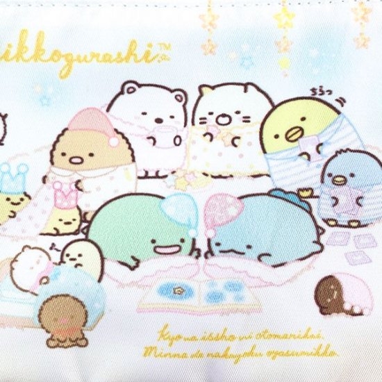 フカフカの枕とお菓子を持ち寄ってお泊り会を楽しむすみっコたちがかわいいデザイン。色はゆめかわなパープルです♡
