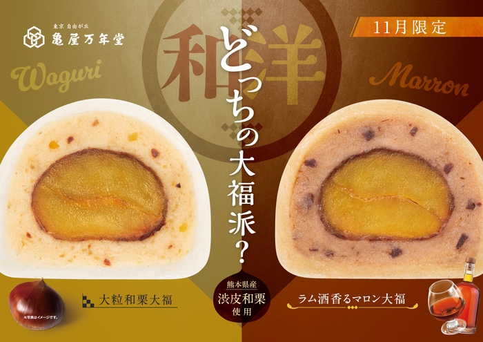 11月は大粒の熊本県産渋皮和栗を一粒まるごと使用し、和風と洋風にアレンジした2種類の和栗大福が登場!