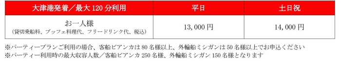 貸切料金550,000円~ デイ・ナイト便貸切可(乗船のみでご利用いただく場合の貸切料は、シーズン・曜日・発着港により変動します)
