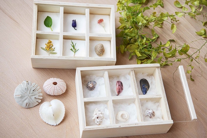 アトリエでの素材との出会いを通して、家に帰ってからも、興味や関心を持った素材への探究を続けられるよう、夏休み期間限定で「標本箱」をプレゼントします。家の中や、住んでいる街、旅行先で、貝殻や木の実、葉っぱなどの自然物でそろえたり、同じ色のものだけ集めたり。見つけたものの中からどれを入れるか、じっくり見て、触って、考える時間を大切にしながら、自分の“好き”を集めた標本箱をつくることができます。