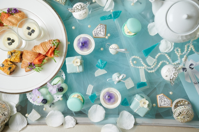 サムシングブルーとはヨーロッパにおける結婚式の伝統的な4つのおまじない“サムシングフォー”の1つで、しあわせを呼ぶ色とされる“青色”をテーマに取り入れました。ティアラやパール、ダイヤモンド、リボンなど、“結婚式”にまつわるアイテムを取り入れたブルーベースの上品なスイーツと、色とりどりの花畑を彷彿させる華やかな軽食プレートを、紅茶やコーヒーのフリーフローとともにご堪能いただけます。