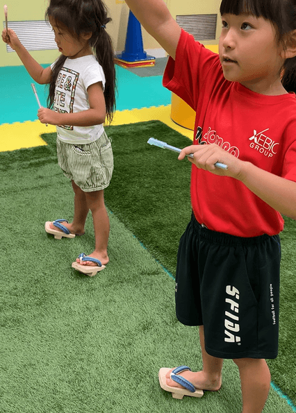 眼育の一環として子供たちが本能的に目を動かすように、砂場遊びよりも風船やボールを目で追いかける遊びを取り入れています。子供が目を大きく動かす工夫を行い、ボールを使って転がす、投げる、蹴る、打つ、取るなどの動きで、目で追う動作を引き出しています。保護者からは「あまり転ばなくなり、転んでも上手く受け身をとれるようにもなったので、体のバランスが良くなった気がします。」「ハイハイが速くできるようになりました。」などの声をいただいています。
