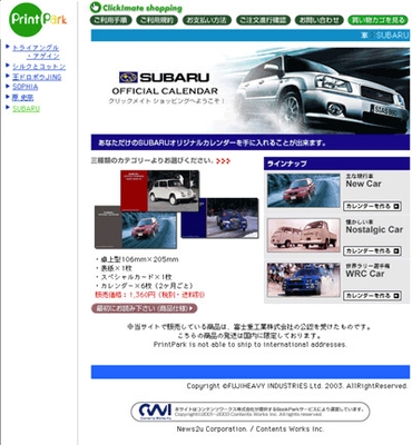 「Print Park」とは、オン・デマンド出版とEC(電子商取引)を組み合わせたオンデマンドグッズ販売サイト。一人一人のニーズに合わせ、お客様自らカレンダーの画像を選び、楽しみながら自分だけのオリジナル商品を作ることが出来ます。今回、スバルのカレンダー用にNostalgic Car/WRC Car/News Carの3ラインナップを御用意しました。
