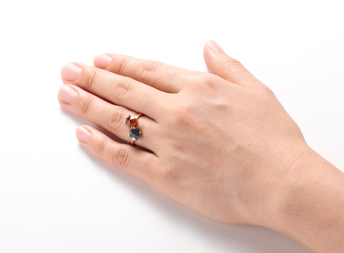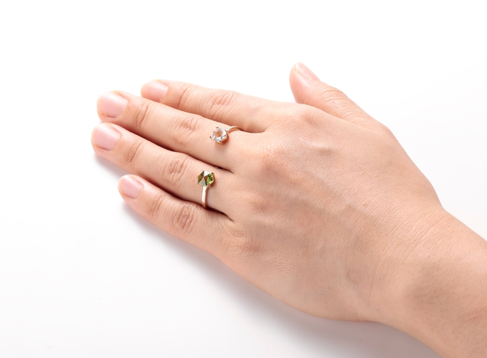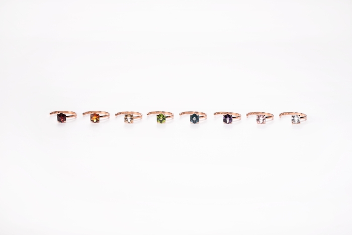 コンセプトにもとづいて、選んだ2色のカラーストーンリングを重ね付けした時、最も美しく指元を飾ります。