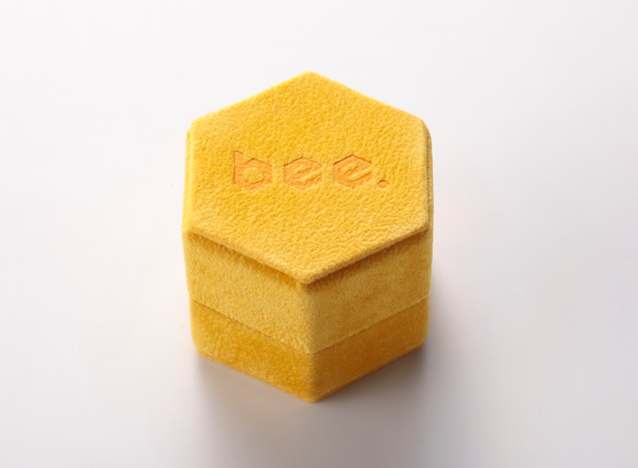 「 bee 」リングの六角形のイエローボックスも "Made in Italy" です。