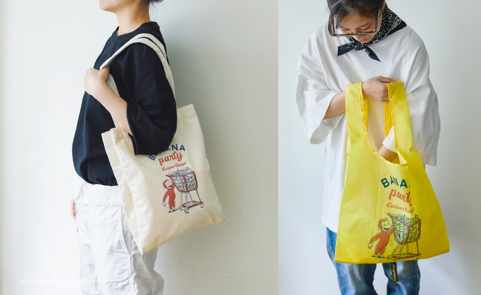 トートバッグは収納スペースが二つに分かれていて収納たっぷり!デイリーユースはもちろん、旅行先などでも活躍します。薄くて柔らかいポリエステルを使用した大きめサイズのエコバッグも、ジョージ&「Banana Party」ロゴ入りで、お買い物に行くのが楽しくなります。