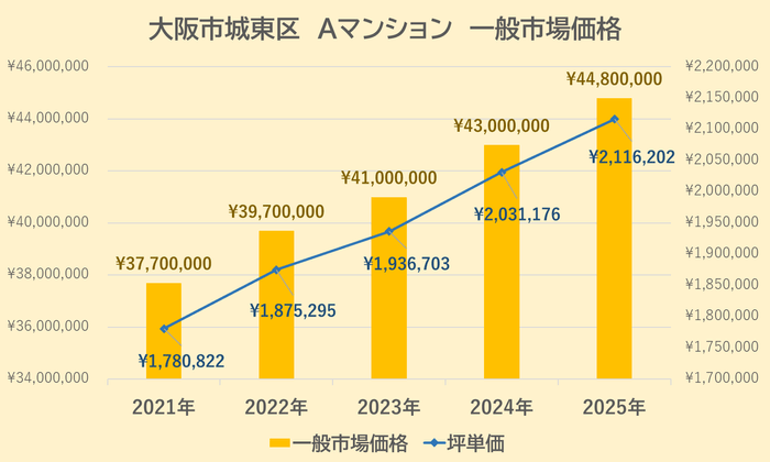 Aマンションの一般市場価格・坪単価の推移は上記【図3】の通りです。