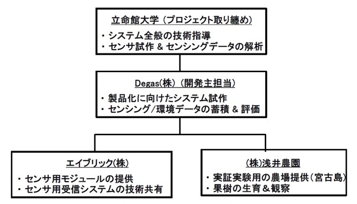 今回の実験において、立命館大学はプロジェクト管理やセンサの試作、センシングデータ解析、Degas株式会社は、システムの製品化に向けた動きや収集したデータの蓄積・評価、エイブリック株式会社は、センサ用モジュールの提供やセンサ用受信システムの技術共有、株式会社浅井農園は、実証実験用の農場提供、果樹の生育・観察を行います。