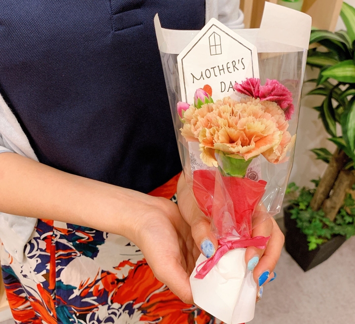 母の日といえばカーネーション。造花だけではなく、東日本橋のフラワーショップ「afloatflowers(アフロートフラワー)」様に特別にお造りいただいたカーネーションのプチブーケを添えることも可能です。