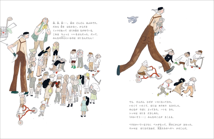 本書は、2022年にスウェーデンのラベーン&シューグレーン社より刊行され、同年の「スウェーデン年間最優秀絵本賞(PICTURE BOOK OF THE YEAR)」を受賞した話題作です。学校の休み時間に友だちとふざけていて、けがをした主人公。あふれでる血に、先生や学校中の子どもたちが集まってきます。けがにより、突然「注目をあびること」になった主人公の心の動きや、まわりの子どもたちの反応を、印象的な絵でコミカルかつ繊細に描いています。