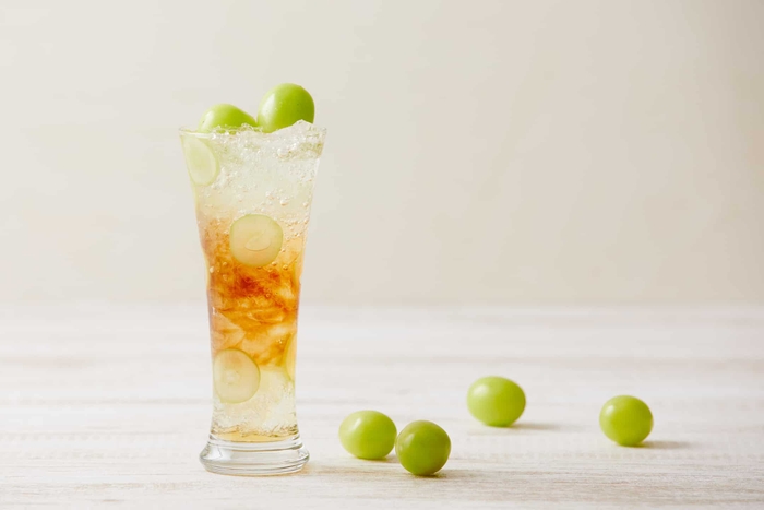 シャインマスカットの濃厚なシロップとアイスティー、炭酸を合わせたドリンクです。シャインマスカットの爽やかな甘みを、香り豊かなアイスティーが引き立て、炭酸でキリっと仕上げました。グラスに浮かべたシャインマスカットの果実とともに、爽やかな味わいを楽しめる一杯です。