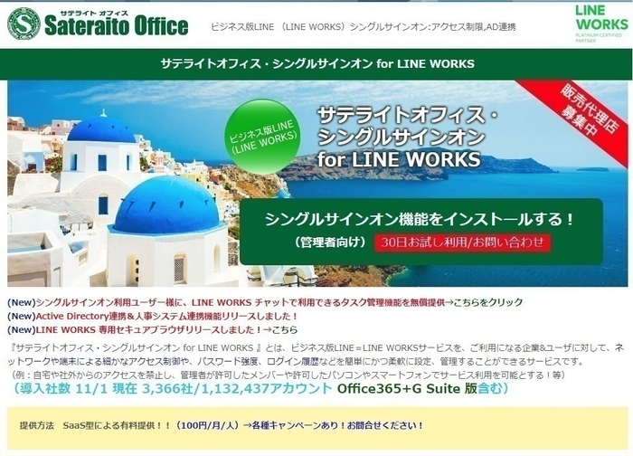 クラウド環境、サテライト環境でのビジネス支援に特化したインターネットシステムソリューションベンダーである株式会社サテライトオフィス(本社:東京都江東区、代表取締役社長:原口 豊、 http://www.sateraito.jp/ )は、企業が保有するActive Directory(以下 AD)とビジネス版LINE「LINE WORKS」および、ビジネス版Facebook「Workplace by Facebook」との連携機能をそれぞれ提供開始したことを発表します。このAD連携機能は、当社で開発したアドオンツール「サテライトオフィス・シングルサインオン」と連携し稼働します。ADに加え、社内人事システムとの連携も可能です。すでに G Suite と Office 365 では、3,000社以上の導入実績があり、LINE WORKS と Workplace by Facebook の導入企業から要望が多かったことから開発し提供することになりました。