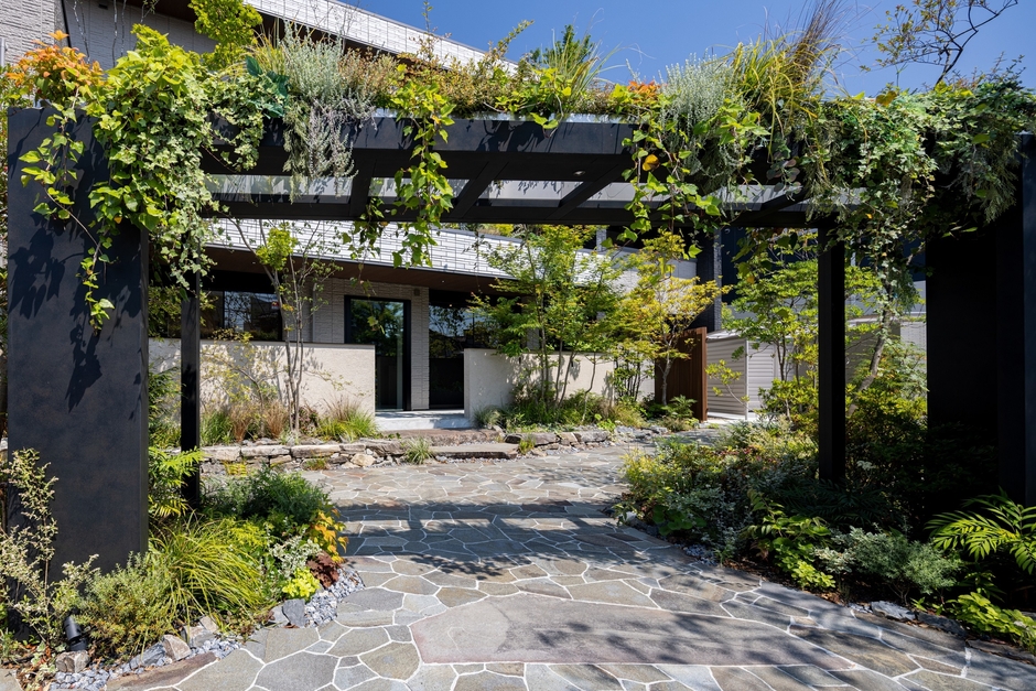 大きな特徴は、「ボタニカルゲート」。これまでのシャーメゾンは、地面に植栽するのが主流でしたが、今回は、普段使っていない2・3階のバルコニーの前や、通常は照明を設置する程度のエントランスゲート部分に緑を配置しました。「ゲートの上から緑を降り注がせたい。その緑のゲートをくぐって入居者の方々に入って欲しい。」そんな思いから、つる系のヘデラを中心に、ノシラン、シャリンバイなどを多用し、「ボタニカルゲート」が誕生しました。