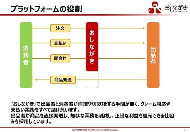 「おしながき」は、出品者様が価格を設定し、正当な利益が還元され、購入者と直接やり取りする手間がなく、注文が入ったら商品を発送するECサイトです。