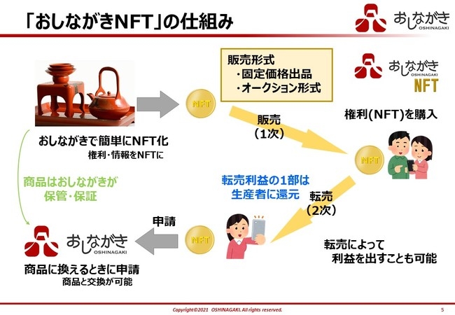 しかし、「おしながき」では、ユーザーが商品をより良いものであると認識できる。出品者が、より付加価値の高い商品販売を可能にするため、ブロックチェーン技術であるNFTプラットフォームを構築することで、これまでの課題を解決し、より高い付加価値を提供します。