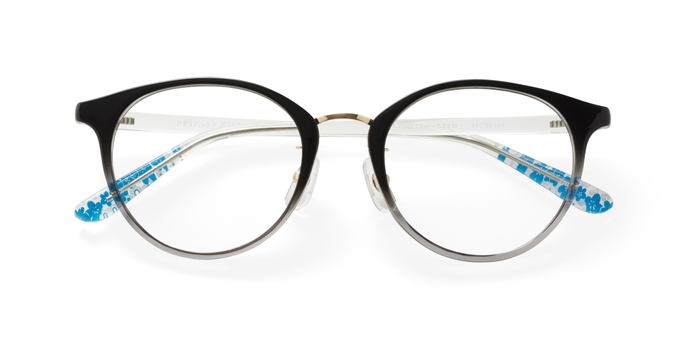 メタルとプラスチックのコンビネーションフレーム。テンプルはグラスをイメージしたクリアベースに仕上げ、先端にアデリアグラスの代表的なモチーフをプリントしています。レンズまわりのプラスチック部分は植物由来成分が含まれたエコ素材を使用しています。