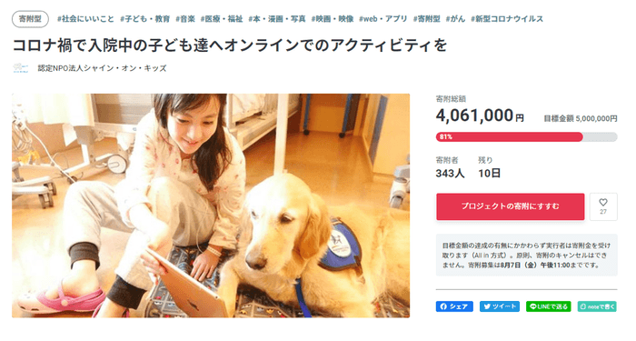 小児がんや重い病気の子どもたちを支援する認定NPO法人シャイン・オン・キッズ(所在地:東京都中央区日本橋本町三丁目3番6号 ワカ末ビル7階、理事長 キンバリ・フォーサイス http://sokids.org/ja/)は、新型コロナウィルス感染症の影響で、困難に直面している入院中の子ども達に寄り添う新たなプログラムを展開するために、6月19日(金)から日本初・国内最大級のクラウドファンディングサービス「READYFOR」にて寄附の募集を行ってきました。7月28日に寄附金額が目標の80%に到達しましたので、お知らせします。