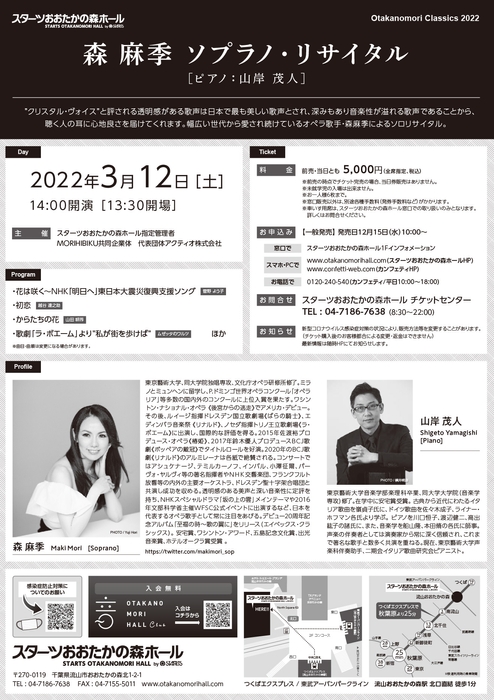 スターツおおたかの森ホール指定管理者MORIHIBIKU共同企業体 代表団体アクティオ株式会社主催による『森 麻季 ソプラノ・リサイタル(ピアノ:山岸茂人)』が2022年3月12日(土)に(千葉県流山市)にて上演されます。チケットはカンフェティ(運営:ロングランプランニング株式会社、東京都新宿区、代表取締役:榑松 大剛)にて12月15日(水)より発売開始です。