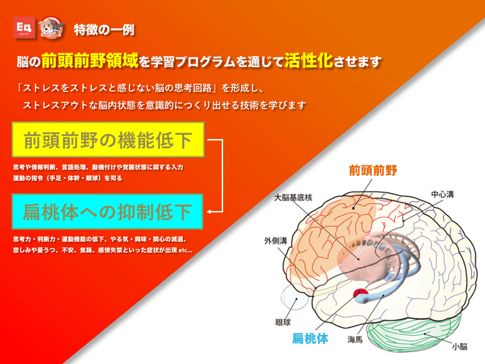 脳の前頭前野領域を学習プログラムを通じて活性化させることで、「ストレスをストレスと感じない脳の思考回路」を形成し、ストレスアウトな脳内状態を意識的につくり出す技術を学びます。今回のオンライン無償トレーニングでは、この部分もお伝えさせて頂きます。