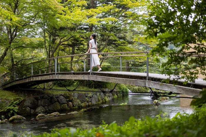 星のや軽井沢の敷地内では、どこにいても自然を感じながら散歩ができます。中央にある太鼓橋では、上流から下流へ流れる水のせせらぎに耳を澄ませ、木漏れ日が差し込む散策路では、心地よい日差しや緑風を感じられます。また、元来この地にあった樹木や傾斜地形を活かしたつくりのため、路地が入り組んでいることも特徴の一つです。路地の先に広がる景色に思いをせ、目の前に広がる風景の変化を楽しめます。