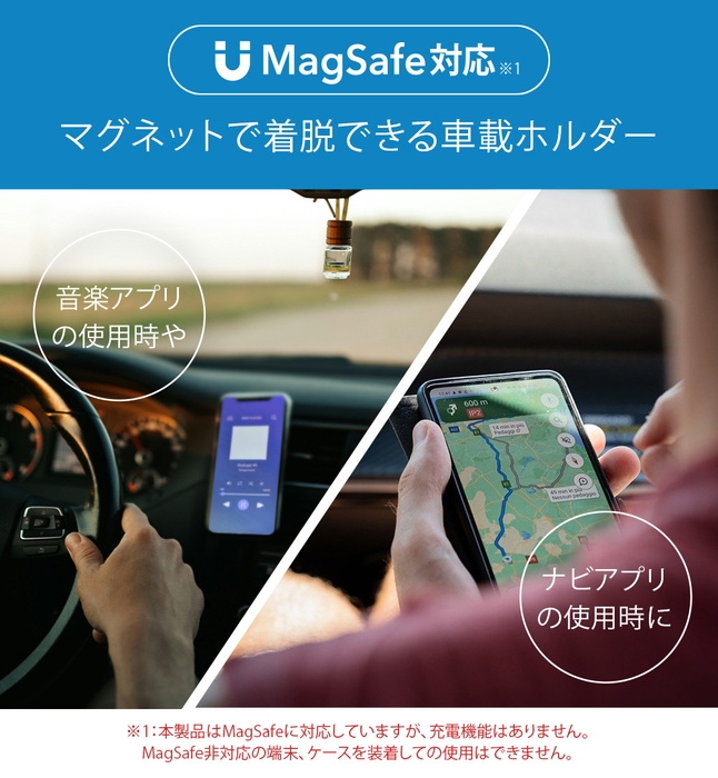 「PG-MGHLD01BK」は、MagSafeに対応したiPhoneをマグネットで着脱できる車載ホルダーです。