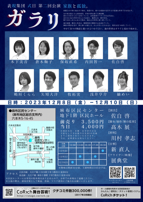 表現集団式日(代表:佐白啓)主催、『ガラリ』が2023年12月8日 (金) ~2023年12月10日 (日)に麻布区民センター 区民ホールにて上演されます。