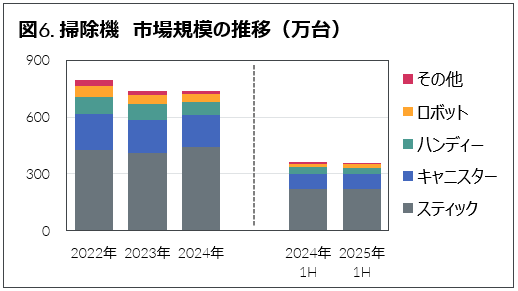 掃除機は前年比2%減の360万台となった(図6)。スティックタイプは前年並みを維持し、数量構成比で前年から1%ポイント増の62%を占めた。他タイプでは、キャニスタータイプが同6%減、ハンディタイプが同3%減と前年を割り込んだものの、ロボットタイプは同10%増と前年から伸長した。掃除機の税抜き平均価格は前年から1%上昇し、26,000円となった。