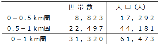 ・店舗から1㎞圏内は単身世帯比率が49.0%、2人世帯比率が23.6%と全体の7割が少人数世帯です。