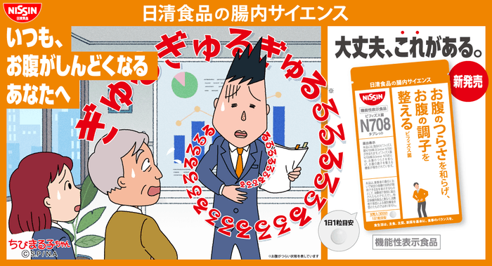 日本アニメーション株式会社(本社:東京都中央区、代表取締役社長:石川和子)がアニメーション制作・ライセンス管理を行う「ちびまる子ちゃん」に登場するキャラクター「山根つよし」が、日清食品株式会社(本社:東京都新宿区、代表取締役社長:安藤徳隆)が販売する「ビフィズス菌 N708 タブレット」のキャンペーンキャラクターに起用されました。