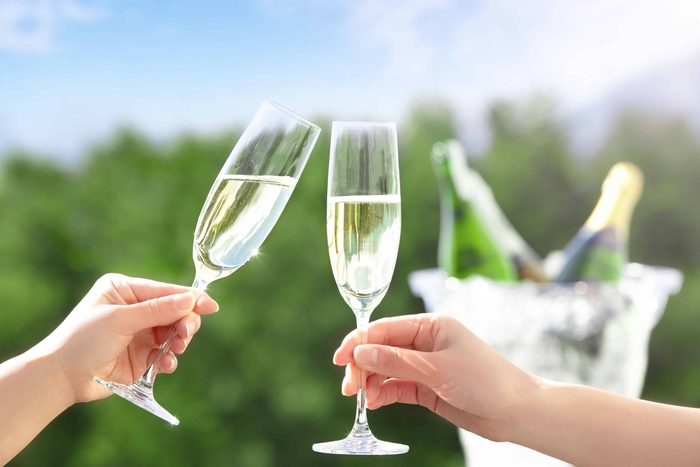 1 山々を望み涼しい風が吹き抜ける広場でスパークリングワインを楽しむ