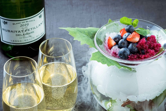 シャリシャリとした食感が特徴の氷菓子、グラニータ。ヨーグルトのエスプーマの上に、ブルーベリーを使ったグラニータと甘口の白ワインで作ったグラニータを乗せました。また、トッピングにはたっぷりのブルーベリーの他、いちごとミントも使用します。いちごは、八ヶ岳エリアの涼しい気候を生かして栽培され、夏でも収穫できる種類のものです。提供時は、器からドライアイスの冷気があふれ、見た目にも涼しい演出をします。果実味豊かなスパークリングワインと合わせると、グラニータとブルーベリーやいちごの甘酸っぱさとの、さわやかな味わいが楽しめます。