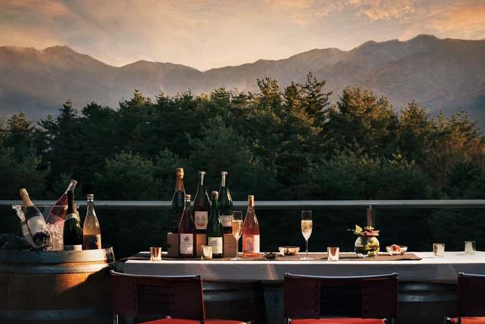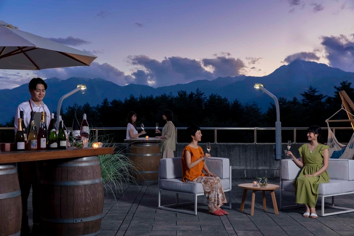目の前に南アルプス、反対側に八ヶ岳を望む広場で、山梨県と長野県のスパークリングワインを厳選した10種類の中から提供します。涼しい風が吹き抜けるテラスで、ソファで寛いだり、ハンモックに揺られたりしながら、リラックスしてスパークリングワインを楽しめます。