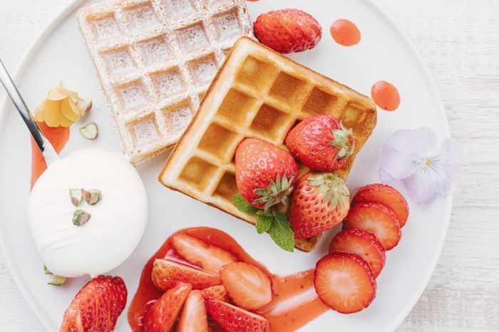 YYgrillでは、朝食に、シェフがお客様の目の前で焼き上げるワッフルを提供しています。生地にじゃがいもを混ぜ込み、外側はさっくり、中はふんわりとした食感に作り上げる人気メニューです。このワッフルに、苺ソースをたっぷりとかけて提供します。冷凍によって凍結濃縮された苺ソースと食べやすくカットした苺、ヨーグルトクリームをトッピングし、春を感じる一皿を楽しめます。
