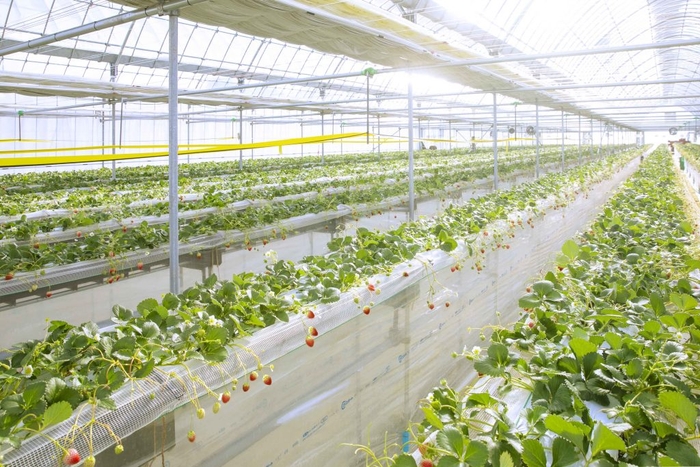 岩窪農場のいちご園は、リゾナーレ八ヶ岳から車で5分ほどの場所にあり、甘酸っぱさが特徴の苺「よつぼし」を育てています。通常、苺の苗は9月に植えますが、よつぼしは発芽したばかりの小さな苗を6月に植える種子繁殖型の品種です。涼しい気候だからこそできる栽培方法を用い、ビニールハウス面積約1,700平米の広さで約13,000株の苺を栽培しています。近隣の道の駅やスーパーマーケットの他、東京都内のレストランにも届けています。苺は寒さにより、糖度が高まり、甘みが増すことが特徴です。北杜市小淵沢は、昼夜の寒暖差が大きいので(*)、甘くて美味しい苺が育てられます。