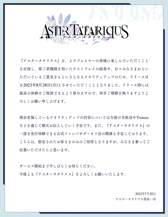 株式会社アニプレックス(本社:東京都千代田区、代表取締役:岩上 敦宏 以下、アニプレックス)は株式会社gumi(本社:東京都新宿区、代表取締役社長:川本 寛之)の事業パートナーとして参画し、スタジオ「Studio FgG(以下FgG)」が開発する2023年夏リリース予定のスマートフォン向け本格シミュレーションRPG『アスタータタリクス(アスタタ)』において、リリース日が2023年8月28日(月)に決定したことをお知らせいたします。また、事前登録者数が25万人を突破いたしました。