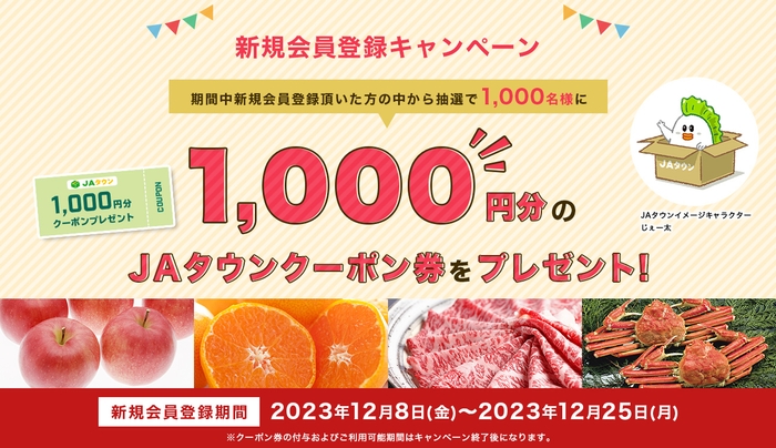 このキャンペーンは、期間中に新規会員登録いただいた方の中から抽選で1,000名様にJAタウンのお買い物で使用できる1,000円分のクーポン券をプレゼントします。