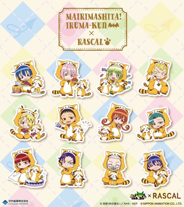 今回のコラボレーションにあたり、ラスカルの着ぐるみを着た入間たちの新たなミニキャライラストを作成しました。ラスカル衣装に身を包んだキャラクターたちとラスカルたちの、ファンには嬉しいアイテムが登場します。