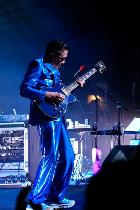 そんな熱い状況の中、今回のツアーが開幕(初日の東京公演はチケット完売)。光沢のあるブルーのジャケットとパンツ姿で登場した高中は、序盤から代表曲「BLUE LAGOON」を演奏し、立ち上がって手拍子で盛り上げるファンに挨拶をするかのように、ギターを弾きながらステージを右へ、左へ。ブルーのYAMAHA SGやFender ストラトキャスターを弾きながら、「BRASILIAN SKIES」などでさらに盛り上げていく。トーキング・モジュレーターを使用する「OH! TENGO SUERTE」、カラフルなソンブレロ(メキシコの帽子)をかぶっての陽気な「M5」、開場全体でコーラス部分の大合唱となった「READY TO FLY」、今回のツアーのキービジュアルにも登場しているサーフボード・ギターによる「Jumping Take Off」など、アンコールを含めて全20曲、全てがハイライトとなった。
