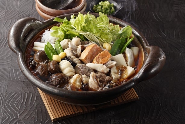 創業天保元年・あんこう料理専門店「いせ源」のあんこう鍋を提供します。冬に旬を迎えるあんこうや独活(うど)などを、江戸時代から続く一子相伝の醤油仕立ての割り下で煮立てて味わう一品です。「いせ源」では、骨抜きや下茹でなどの丁寧な下ごしらえをしているため、あんこう本来の奥深い味わいを堪能できます。また、あん肝や大身(だいみ)、皮や鰭(ひれ)など、あんこうの7つ道具(*1)を入れているので、部位ごとに異なる食感が楽しめます。鍋の〆は、あんこうの旨味が染み出した出汁で仕立てるおじやです。一口食べれば、思わず笑みが溢れるほどの味わいが口一杯に広がります。「いせ源」の女将から指導を受けたスタッフが火加減や〆作りのサポートを行うので、銘店の味を堪能できます。