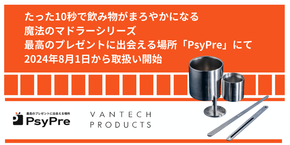 滋賀県で排水処理事業を中心に取り組み、そこから生まれた独自の金属加工技術とプロダクトデザインを掛け合わせたブランド「VANTECH PRODUCTS(ヴァンテックプロダクツ)」を展開する有限会社ヴァンテック(所在地:滋賀県栗東市、代表取締役:井之口 哲也)は、魔法のマドラー“220mm”・“170mm”魔法のタンブラー“78mm”魔法のぐい呑み“50mm&Φ8”を、2024年8月1日(木)にグランドオープンするオンラインギフトモール「PsyPre(サイプレ)」(Psyve株式会社運営)にて販売開始いたします。