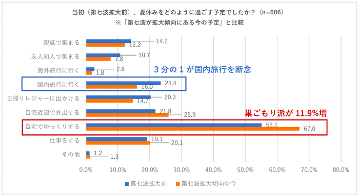 「第七波拡大前に夏休みをどのように過ごす予定だったか」という質問に対しては、最多が「自宅でゆっくりする」55.1%、次いで「国内旅行に行く」23.4%、「自宅近辺で外出する」21.8%だった。「親族で集まる」は14.2%にとどまった。