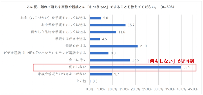 「離れて暮らす家族や親戚とのおつきあいで何をするか」の質問に対しては、最多が「何もしない」39.9%、次いで「電話をかける」21.0%、「会いに行く」17.5%だった。