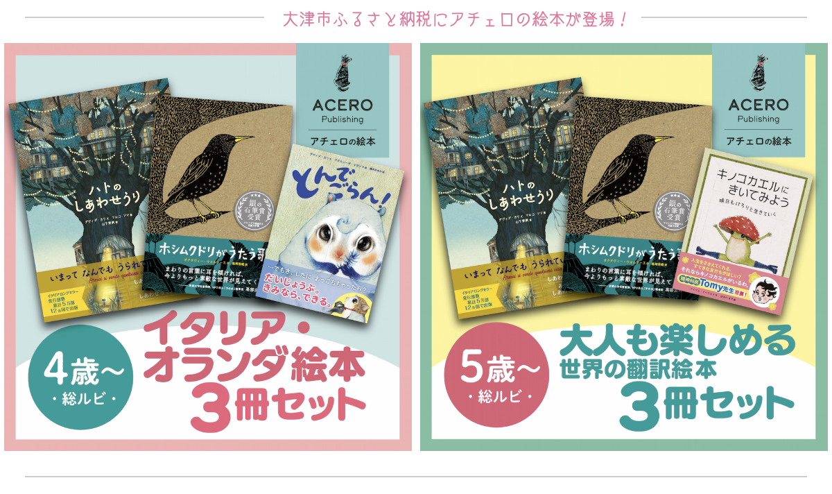 海外絵本を翻訳・刊行する出版社、アチェロ(所在地:滋賀県大津市、代表:田村由記子)の絵本セットが、このたび滋賀県大津市のふるさと納税返礼品に加わりました。