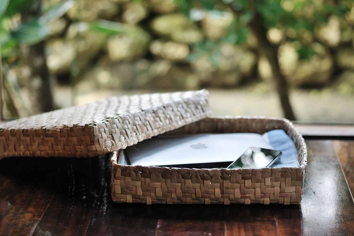 沖縄の原風景が残ると言われる竹富島で、青い海、南国の花、三線の音色など、ゆっくりと流れる島時間の中でデジタルを忘れて過ごします。チェックイン時にデジタル機器を預け、滞在中はデジタル機器から離れた環境で過ごします。デジタル機器を保管するボックスは、島に伝わる「手業(てぃわざ)」の作品です。島の植物を素材にし、すべて手作業でつくられています。