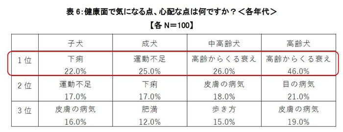 年代別では子犬は「下痢」(22.0%)、成犬は「運動不足」(25.0%)、中高齢犬・高齢犬は「高齢からくる衰え」(26.0%・46.0%)がそれぞれ最も多くなっています。