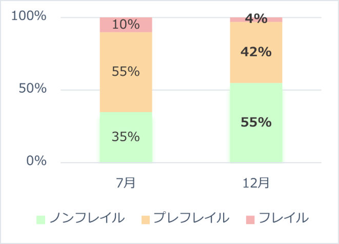 期間中、参加者は3か月に1度、フレイル状態のチェックを行いました。教室に参加する前の昨年7月と、5か月間運動を継続した12月の結果を比較すると、ノンフレイルと判定された方の割合が約20%増加、フレイル・プレフレイルと判断された割合は減少しました。また、参加者の多くで握力や5m歩行の数値の改善が見られ、運動量の変化や体の動かしやすさに変化を実感してもらうことができました。