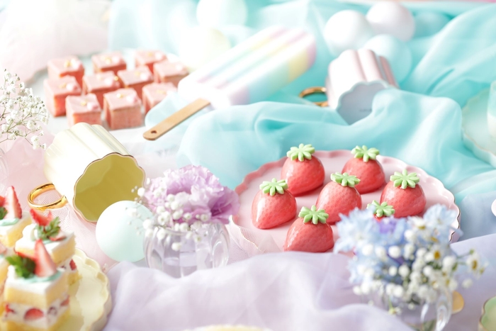 ストリングスホテル名古屋の名物スイーツブッフェ、2022年7月~8月の期間は“パステルカラー”をテーマに、ゆめかわスイーツが勢ぞろい。5色から選べる特製ウェルカムドリンクから始まり、『ろりぽっぷぜりー・いちごむーす・まかろん』など、すべてのメニューをひらがな表記に、ブルー、グリーン、ピンク、イエロー、パープル、オレンジなどの彩り豊かな絶品スイーツをご用意いたしました。また、シェフ特製彩り鮮やかな冷製スープ、ポップコーンなどの軽食もご用意しているので、甘いものとしょっぱいものを交互にお楽しみいただけます。
