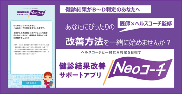 “パーソナルヘルスコーチングサービスでユーザーに寄り添い健康改善を応援” ネオファースト生命が提供する健診結果改善サポートアプリ 「Neoコーチ」をネオスが開発